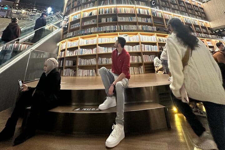 Continue to the spectacular Starfield Library (Byeolmadang Library) inside COEX Mall — famous for its soaring bookshelves, warm light, and hidden photo spots loved by locals and influencers alike.
